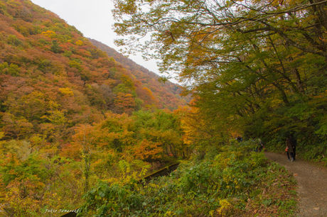 バスを降りて、最初に見えるのは秋田県で最古の吊り橋「神の岩橋」です。この吊り橋に紅葉がうまく調和して良いですね。