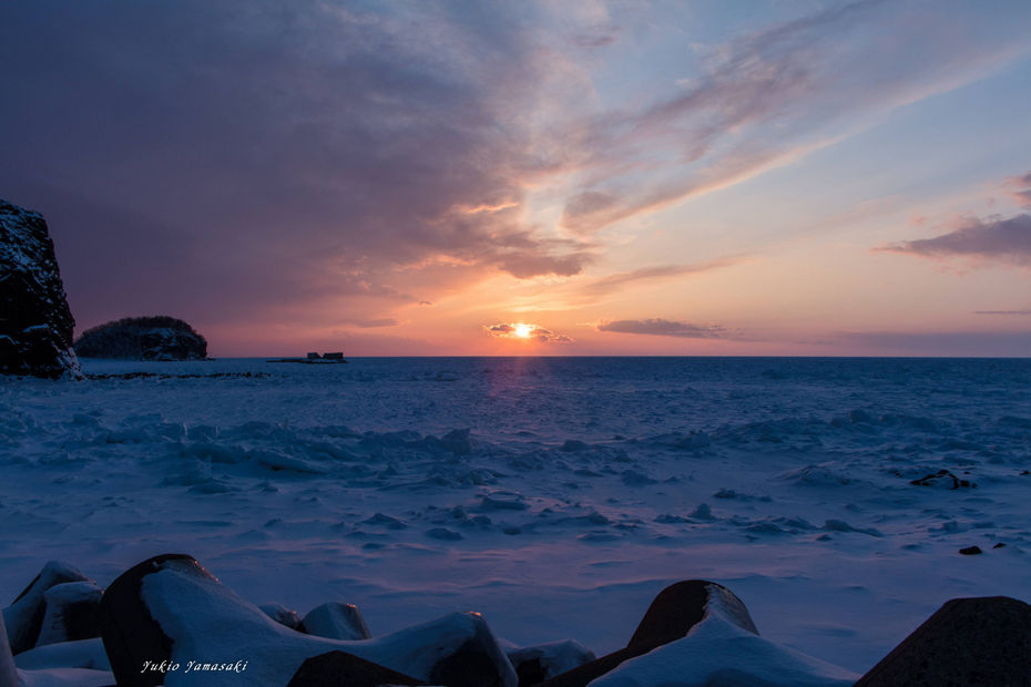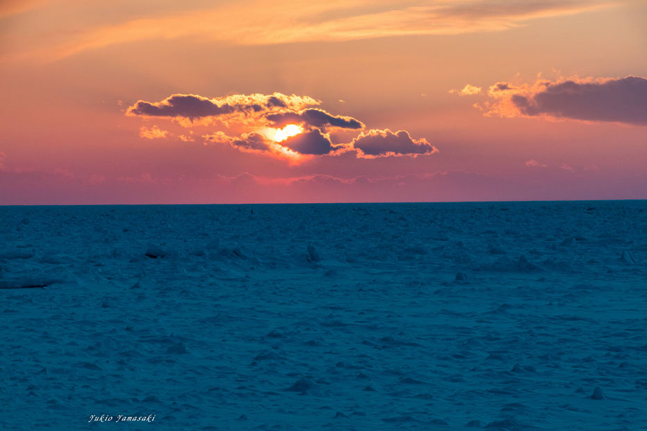そして、ウトロは夕日がきれいに見えることで有名ですが、非常に寒い中、流氷越しの夕日が素晴らしい景色を生み出してくれました。